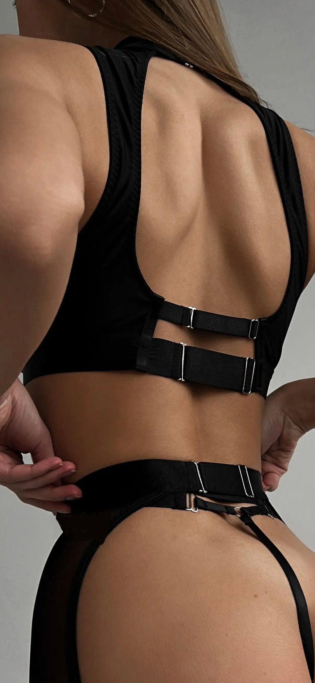 This pole-friendly lingerie set combines soft mesh panels with a secure, sculpting fit that enhances your shape while allowing full freedom of movement. The high-neck top offers support and coverage where you want it, while the adjustable suspender belt and garter straps frame the hips and thighs beautifully for exotic pole, floorwork, and low-flow choreography.